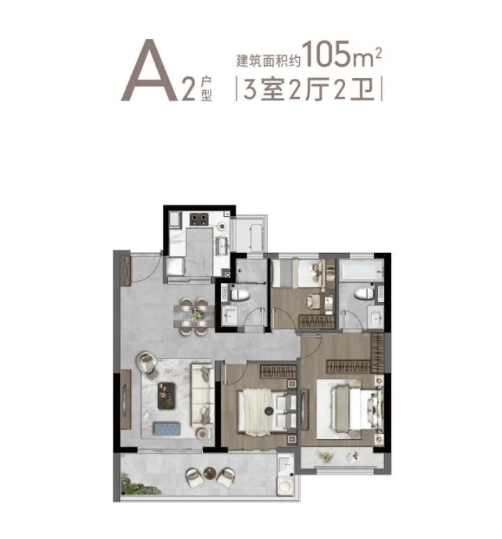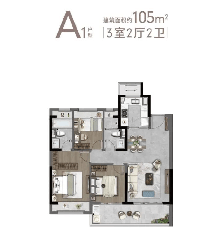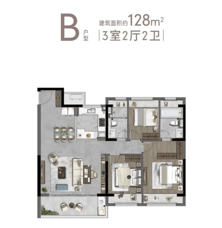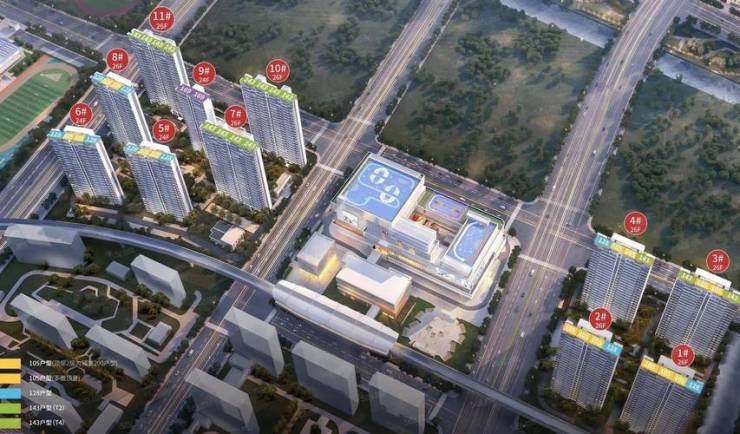 主力户型:105㎡三房、128㎡三房、143㎡四房、169㎡四房