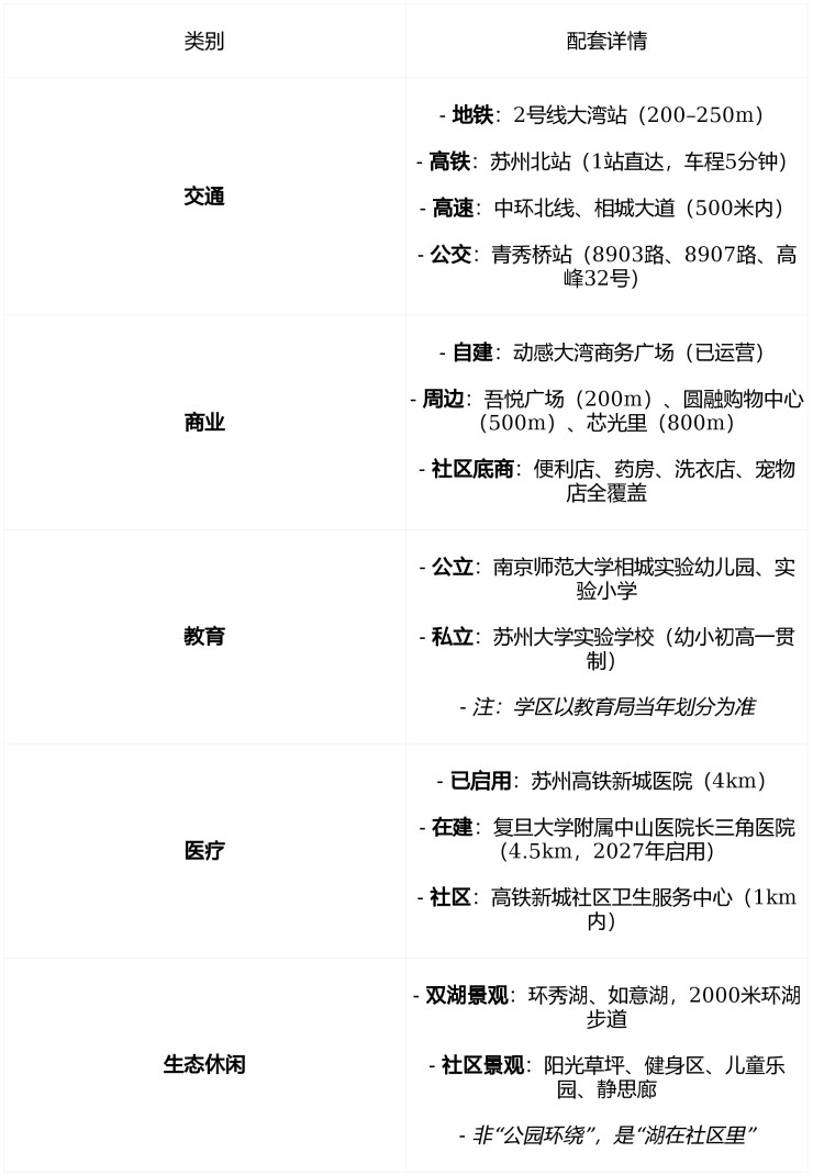 | 医疗托底 | - 苏州高铁新城医院 :直线距离4公里,2025年已启用