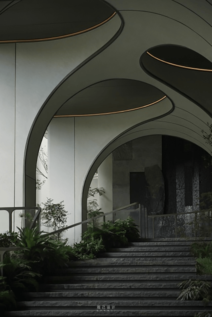 门楼内提取线条与门柱融合,仿佛是一股气韵将屋檐向上托举,提取自苏州砖雕窗花的形态,极致的线条交错下,在摩登感中融入苏州古建特有的灵动韵味。