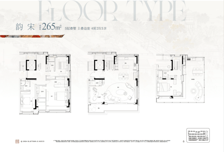 户型面积:叠墅5F上叠:265平米/280平米