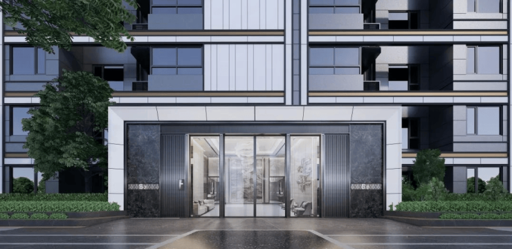 楼盘外立面:建筑外立面,实现千年古韵与现代立面美学结合,材质采用了世界塔尖奢宅标配的铝板和钻感玻璃,珍珠蓝搭配局部驼色点缀。