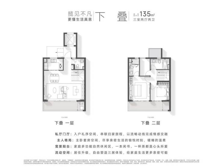 定制空间:全横厅设计、LDK多功能家庭区;功能间配置+灵动空间设置;建面约135㎡以上户型,全3卫配置,居住品质更高。