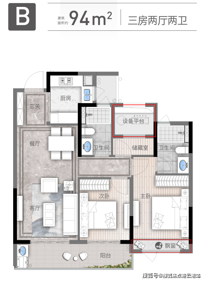 94㎡三室两厅两卫:全明设计,双联大阳台,U型厨房