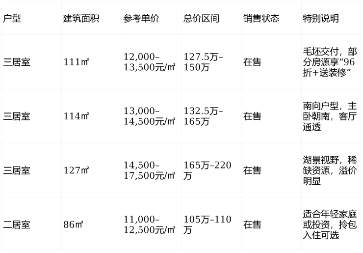高舒适户型:主力户型为86㎡、111㎡、114㎡、127㎡三居室,1梯2户或2梯4户设计,得房率79%以上,采光通透,适合三代同堂或改善型家庭。