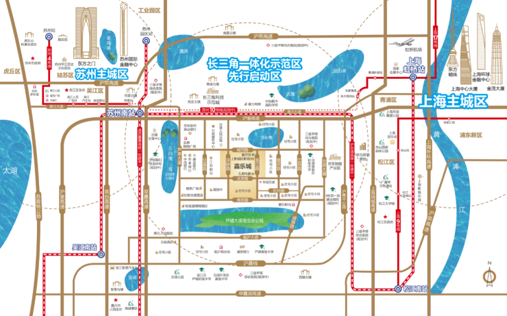 区位稀缺性:位于长三角一体化先行区——汾湖CBD核心,紧邻上海、浙江,是“环沪最强担当”,未来将直连上海轨道交通17号线延伸段与苏州南站(在建),8分钟直达松江,20分钟抵达上海虹桥枢纽。