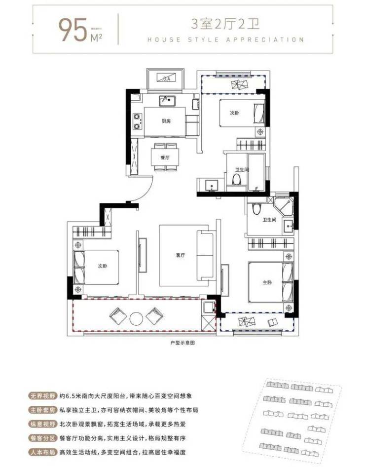 95㎡三居室:总价135-145万,格局方正,南向设计,采光充足