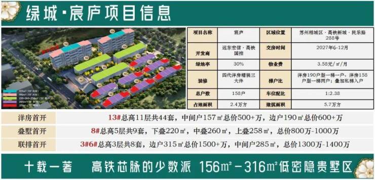 绿城·宸庐是由苏州宏相城市建设发展有限公司开发的高端住宅项目,位于苏州相城区高铁新城民乐路东、陶村街北(地铁2号线大湾站向北约200米)。 项目总占地面积约2.4万平方米,总建筑面积达5.76万平方米,容积率仅1.4,绿化率30%,规划包含7栋3层联排别墅、3栋5+1层叠墅和2栋11层四代宅洋房,共计158户,机动车位配比1:1.8,采用精装与毛坯相结合的交付标准,预计2025年10月底首开。