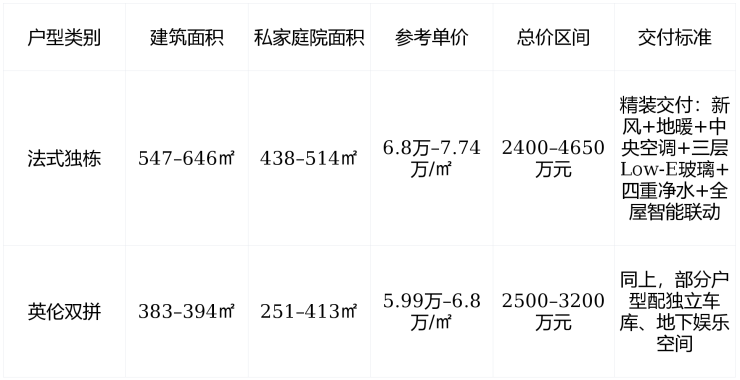 总户数 :仅 32席 (8栋法式独栋 + 24栋英伦双拼)