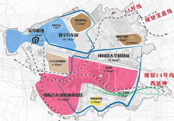 嘉定新城立足打通长三角一体化和虹桥国际开放枢纽的链接通道,构建“一核一枢纽、两轴四片区”的规划新格局。“一枢纽”即安亭枢纽——以安亭北站、安亭西站为核心,无缝连接虹桥国际开放枢纽,打造站城一体化、辐射长三角的综合交通枢纽。(信息来源:《嘉定新城总体城市设计》)