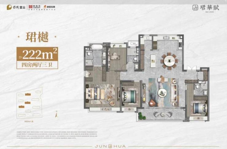 :152㎡、156㎡、190㎡、222㎡(均为四房以上设计,主卧套房化)