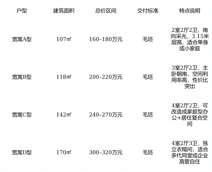 产权清晰、政策友好 :住宅/宽寓产品产权40年, 不限购、不限贷、不限售 ,民水民电通燃气,毛坯交付,层高3.15米,适合创业者、自由职业者、投资客灵活改造使用。