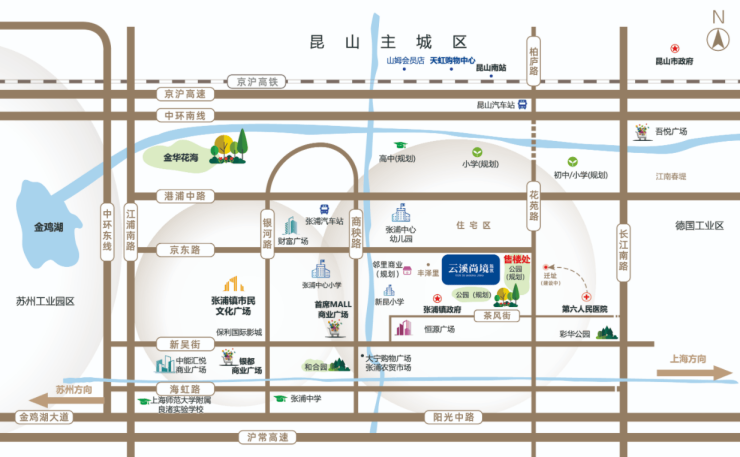 自驾出行:紧邻长江路、机场路等城市主干道,15min可直达昆山南站,30min通达苏州湖东CBD;柏庐路延伸段在建,未来将无缝对接昆山主城,进一步提升自驾通勤效率。