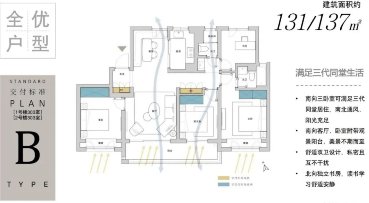 主力户型:111㎡三居、131-142㎡四居,全明设计,双阳台,主卧朝南