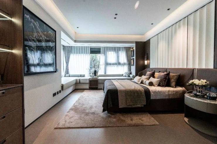 建筑面积约205-285㎡的独层环墅,则赋予更大的空间尺度感。三层两户,最大户型单层可达8面宽,约3.3m层高,部分旗舰户型采用三套房设计,270°转角飘窗+独立衣帽间+双台盆卫浴,让卧室自成一个小家。建面约285㎡的下叠,光是约300㎡的院子,就让人疯狂心动。