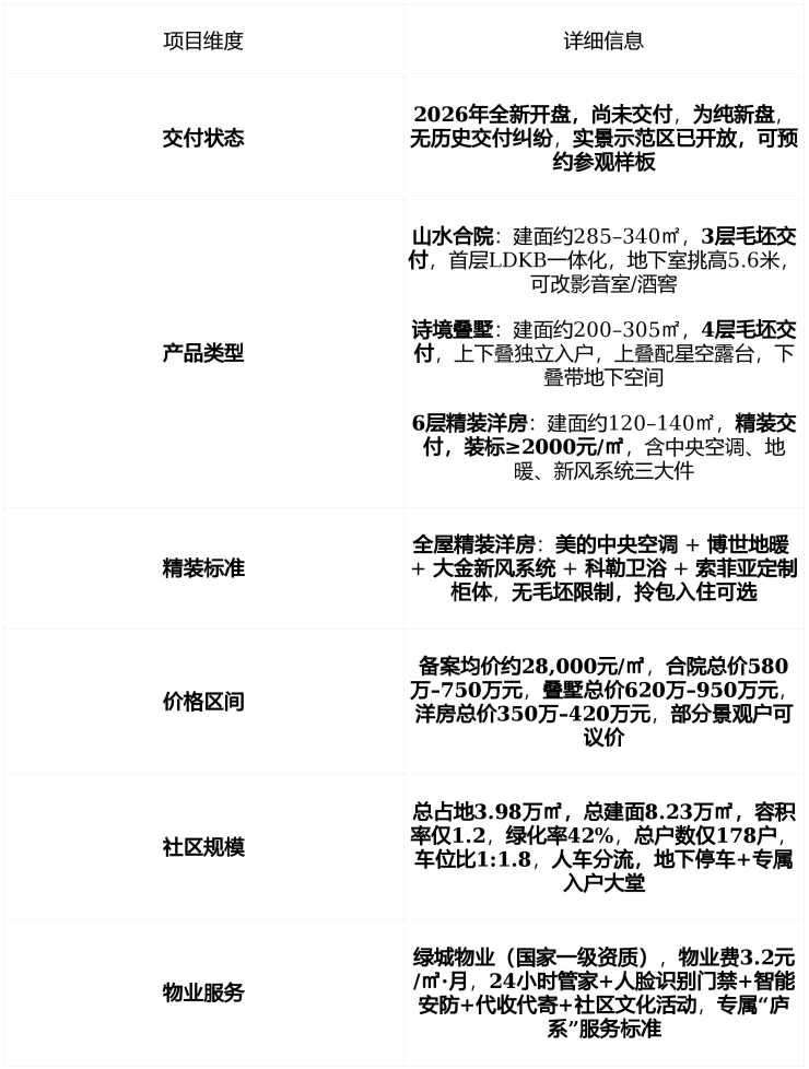 在售状态2026年全新开盘,纯新盘,无交付记录主力产品为低密墅居体系非高层住宅剩余房源充足,首开即售备案均价约28,000元/㎡总价区间580万–950万元为苏州主城罕见“容积率1.2+地铁口+三山两湖”改善型低密社区