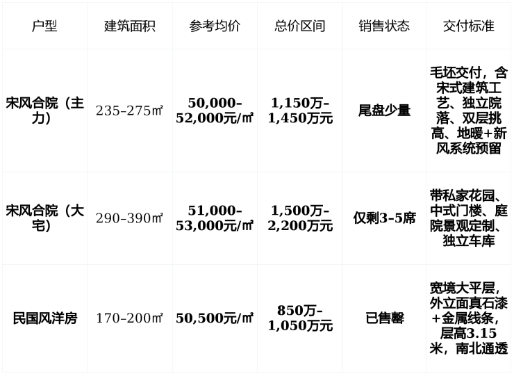 💰 在售情况:主力240–400㎡宋风合院,均价5万/㎡,总价1050万起,尾盘稀缺