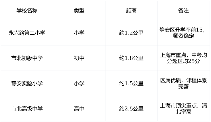 学区说明 :新房无“学区房”承诺,但属 静安教育强区核心辐射圈 ,近年划片稳定,市北初级中学为区内“硬通货”,家长普遍视其为“ 可赌性极强的学区资产 ”。