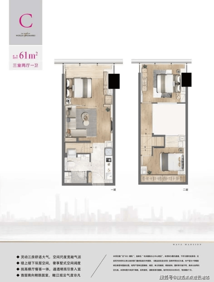 双子塔地标造型,34层以上为瞰江大平层(最低层高150米),可俯瞰钱塘江全景