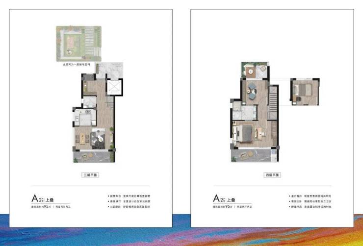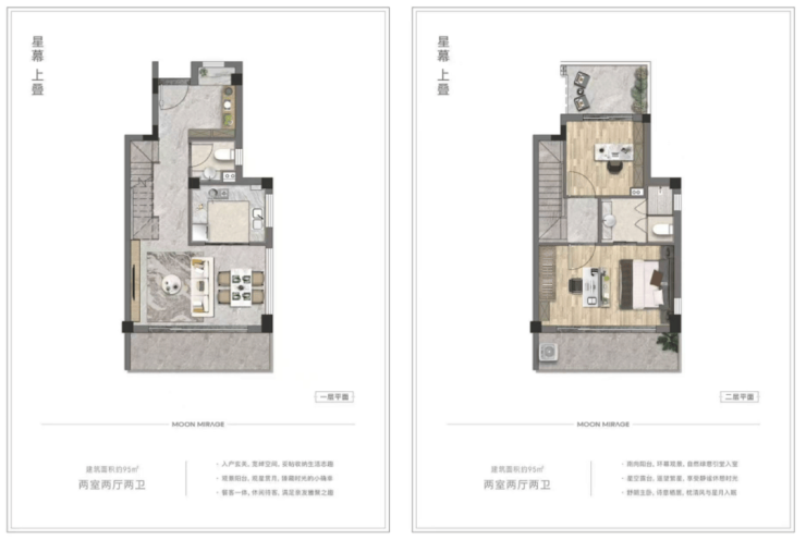 95㎡上叠:两室两厅两卫,赠送约20㎡阁楼,可做书房、儿童游乐区或储藏间,顶层带全景露台,观星观湿地;