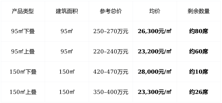 整体均价 : 约23,000–28,000元/㎡,为上海全市单价最低的“低密叠墅”产品 ;