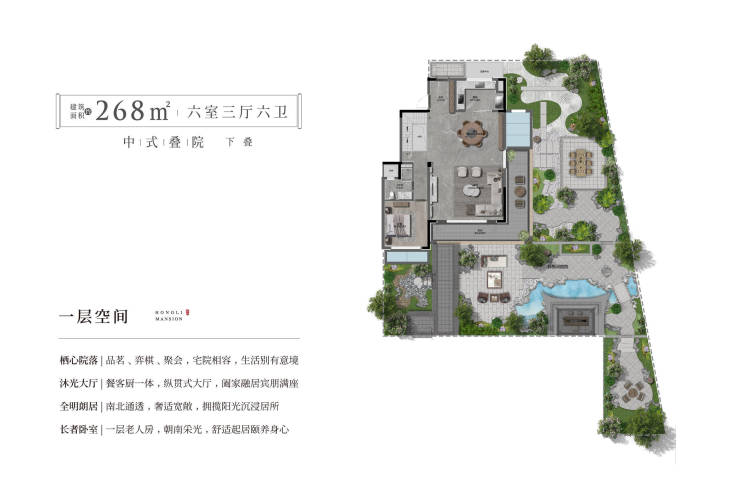 下叠:建面245-275㎡,六室三厅六卫,总价412万起,赠送院子65-300㎡及地下室(挑高5.6米)