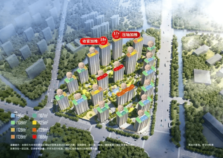 主力户型:建面约96㎡三房两厅两卫、108㎡三房两厅两卫、128㎡四房两厅两卫、143㎡四房两厅两卫及168㎡四房两厅三卫。