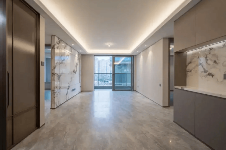 外立面采用四面铝板+玻璃幕墙设计,搭配超60米宽大门、十扇石材屏风及透光云石藻井,营造“新中式”豪宅气质。
