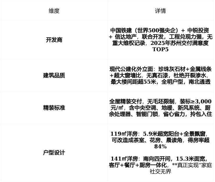 核心优势中国铁建+中锐+信达联合开发 + 中铁建物业(2.44元/㎡·月) + 容积率仅1.2,绿化率37% + “宋锦缂丝”灵感2轴4巷10园苏式园林 + 119㎡洋房标配5.9米超宽阳台+全景飘窗 + 下叠带40–100㎡私家庭院+地下室 + 对口太平实验小学(直线1.4公里) + 步行10分钟达规划地铁7号线春申湖东路站(2026年通车)2026年苏州主城外“现房低密+学区明确+交通升级”最后优选