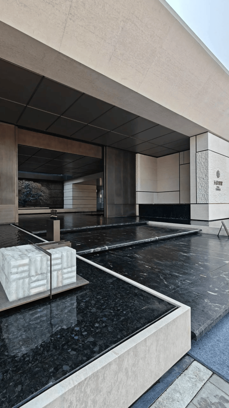 高层外立面由GOA大象设计陆皓操刀,采用横平竖直的立体框感设计,摒弃浮夸曲线,追求静谧美学;叠墅“瑞园”则借鉴蒙德里安画作风格,以石材与金属框格形成错落框景,建筑本身即成风景 。
