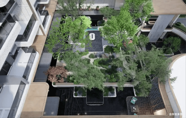 40%绿化率社区 :内部景观以“水漾·森海”为主题,设计“一环、两轴、两园、九院”体系,融合森林静谧与海洋灵动,打造四季有景的沉浸式园林。