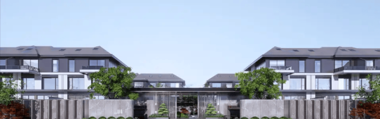 建筑风格:现代中式建筑风格,外立面1-2层为干挂石材搭配铝板线条,搭配灰色坡屋顶,兼具质感与古典韵味。