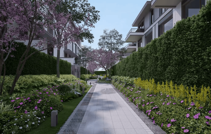 社区景观:小区内“一轴双环六景”设计,绿化率35%-37%,营造“三季有花,四季有景”的居住体验。