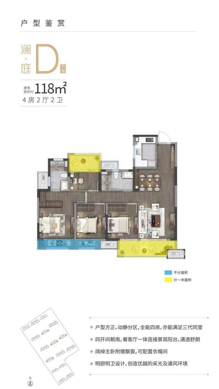 ● 空间之美建筑面积约80-119㎡全生命周期户型,二房到四房设计,承载从二人世界到三代同堂的家庭进阶过程,60%精装比例,适应不同家庭所需,构筑更为丰盈的生活场景。我们希望为每一户打造的家不是过渡,而是一生居所。