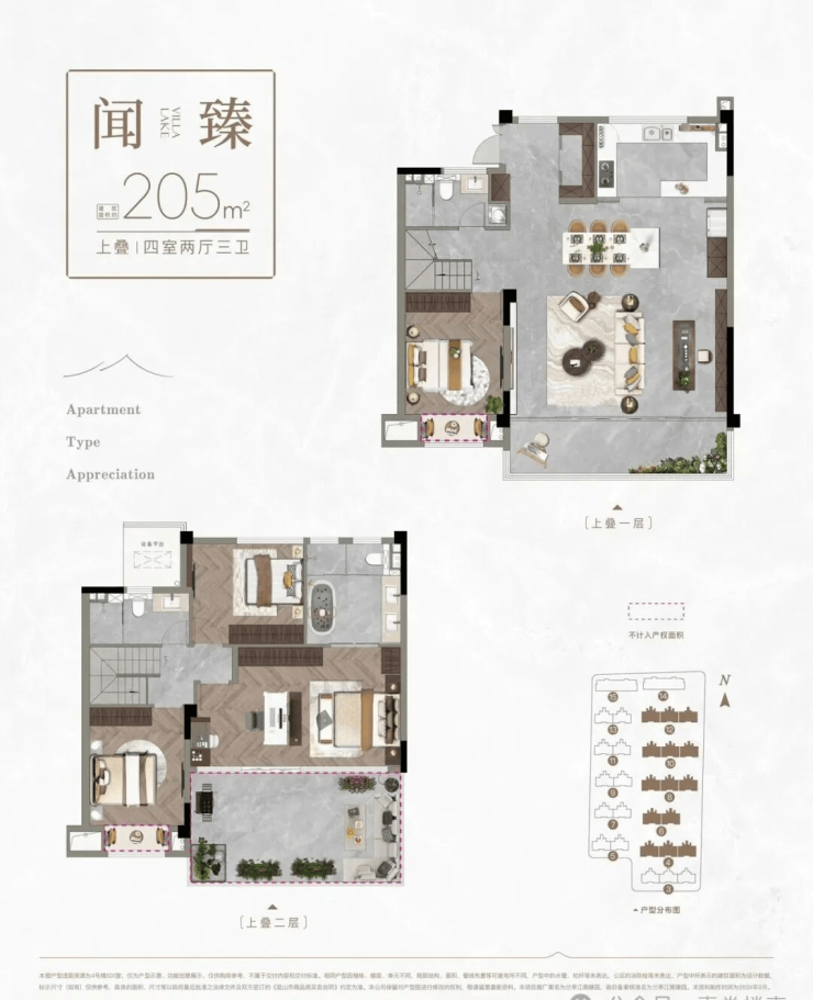 · 上叠:205㎡ 四房两厅三卫,赠送约22㎡阔景露台。