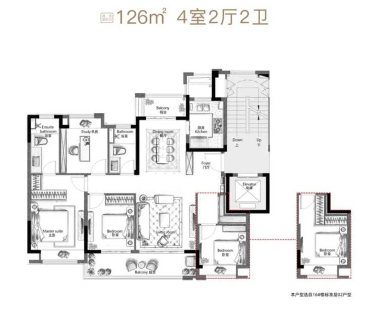 建面约126㎡四房两厅两卫,能满足对生活的所有需求,真正实现进阶改善。