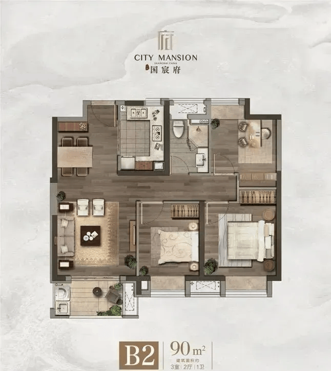 建面约90㎡,2室2厅1卫,总价约263万–286万元