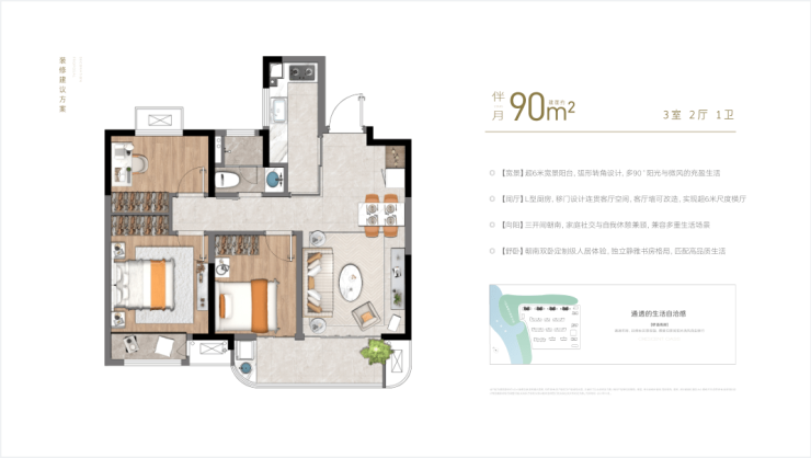 户型面积特点总价区间91㎡三居室91㎡经典竖厅设计,南向双卧+U型厨房,超6米宽景阳台约142-155万1