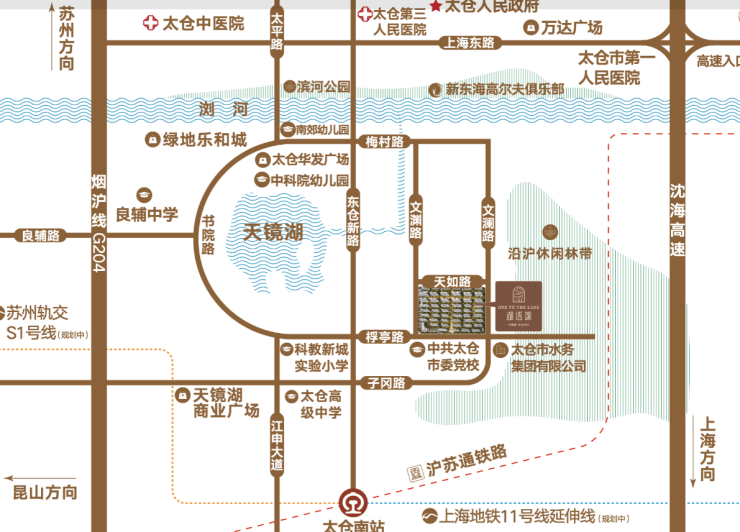 三面环湖,湖景资源不可复制 :项目紧邻 天镜湖公园 (直线800米),部分楼栋直面湖景, 晨跑观水、傍晚听风 ,是太仓唯一能“ 住在湖边 ”的低密社区。