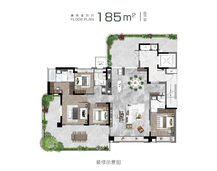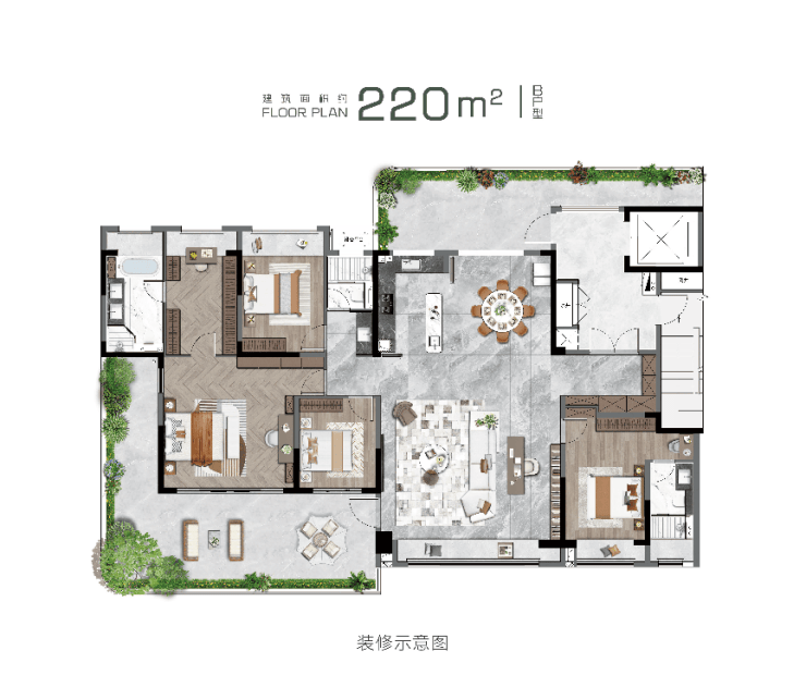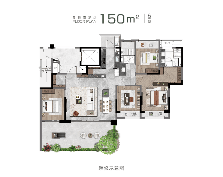 产品规划:建面约150㎡、185㎡、220㎡,户均约30-50㎡空中庭院