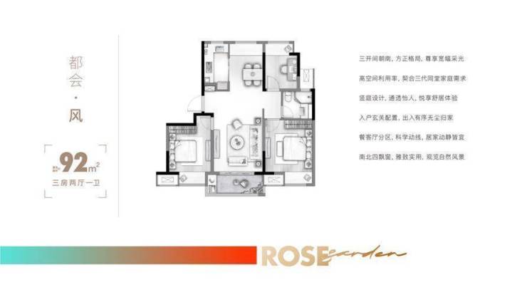 面积布局特点92㎡三室两厅一卫一梯两户,得房率85%
