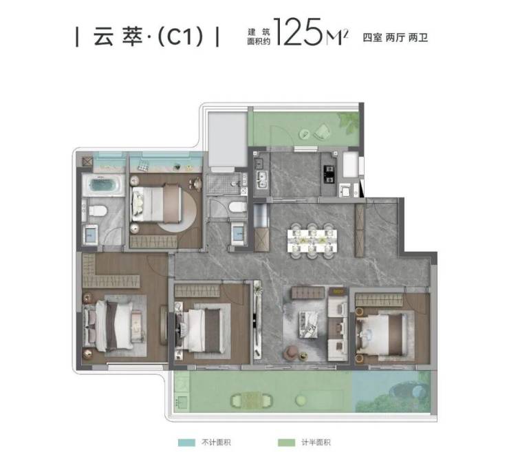3、户型实际使用率高:错层阳台设计,超大的赠送面积(实际使用率高达约100%),南面双阳台(半赠送)+露台(全赠送),北面生活阳台(半赠送),全景飘窗,利用率高;