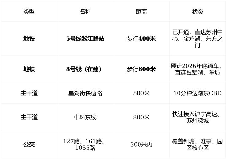 到苏州中心约15分钟地铁,到上海虹桥约50分钟高铁(从苏州站出发),真正实现“园区生活,沪苏通勤”。