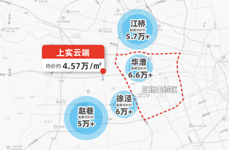 目前华新作为后起之秀,仍处于价格洼地,均价为4万+,目前区域内已售的楼盘有御澜博翠4.6万/㎡、虹桥金茂悦4.6万/㎡。