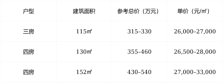 主力户型 :建面约115㎡、130㎡、152㎡三至四房,均为纯洋房设计,无高层干扰。