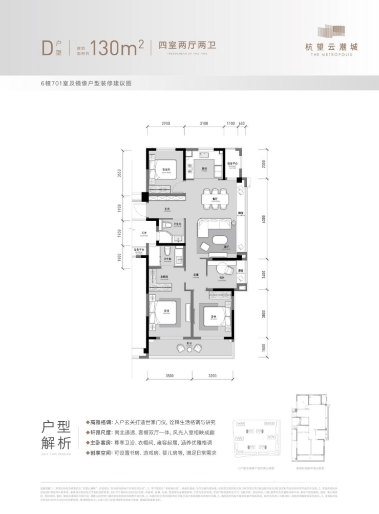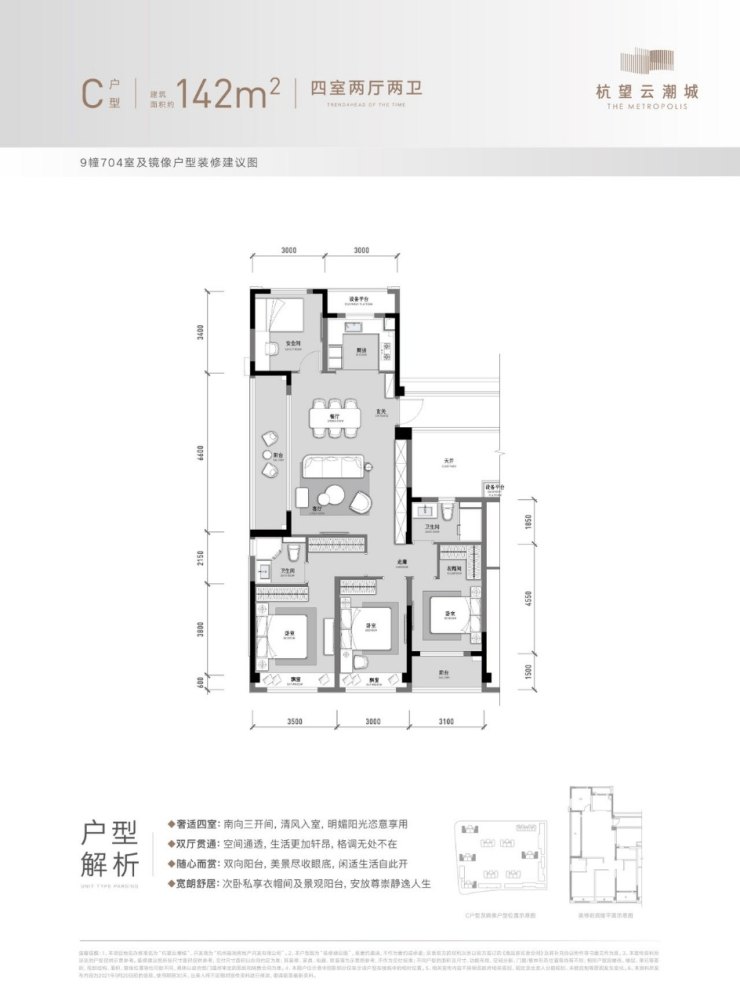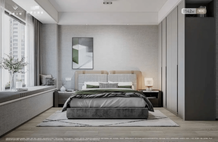 此户型是该项目最大的改善型户型,建筑面积约 142 平方米,整体格局为四房两厅两卫。