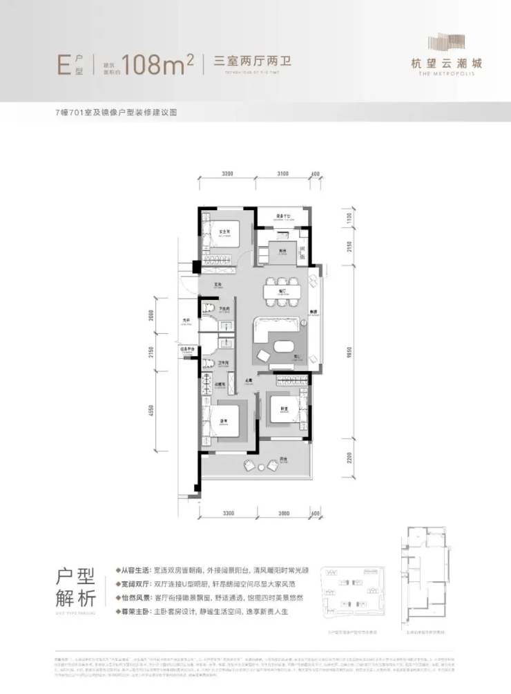 此户型作为该项目的起步户型,建筑面积约在105至108平方米之间,采用三房两厅两卫的布局。