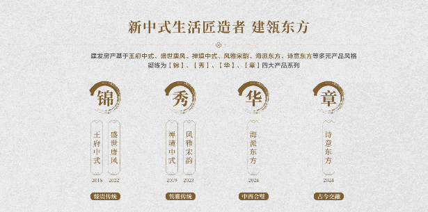 建识东方,发献大美,建发房产基于王府中式、盛世唐风、禅境中式、风雅宋韵、海派东方、诗意东方等多元产品风格,凝练为【锦】、【秀】、【华】、【章】四大产品系列。