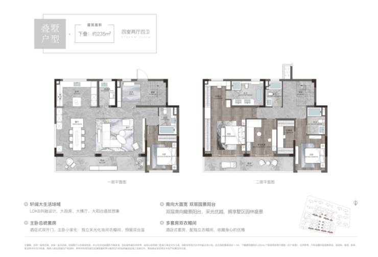 容积率1.5–1.8的低密社区,规划44栋住宅,涵盖高层(105–120㎡)、**洋房(128–143㎡)叠墅(172–235㎡)**三大产品线。高层得房率74%–80%,洋房80%–84%,叠墅87%–100%,空间利用率极高。叠墅采用四代设计,下叠赠送地下室,上叠配备双露台,满足终极改善需求。400 998 3632旭辉溪前雅居营销中心电话