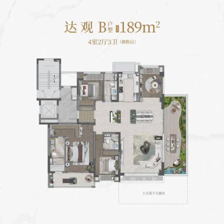 洋房:建筑面积145-189㎡,部分为第四代空中院墅创新设计,精装交付(装标3000元/㎡),总价441-1052万元