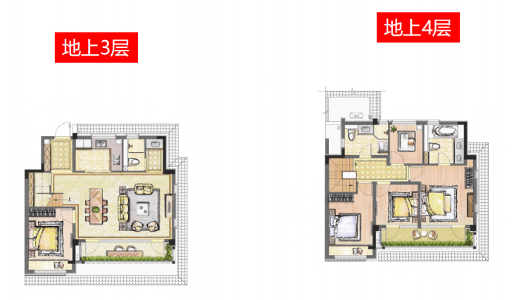 再来看建面约169㎡上叠户型,整体布局与下叠类似,拥有上下双层阳台,足以匹配三代同堂或者多孩家庭长久居住。